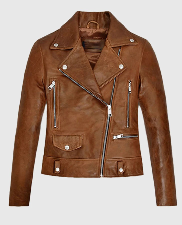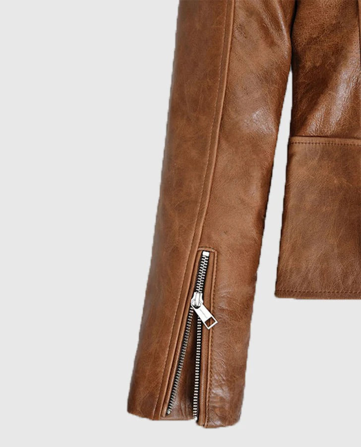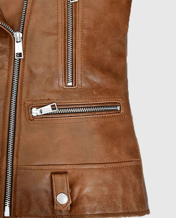 Our piece is made with the utmost precision. To begin with, it is genuine leather, which is smooth and durable. The Collar has a traditional Notch Lapel Collar to give it a chic appearance. Also, the Front has a stylish, Asymmetrical Zipper Closure. The Sleeves are long and end with cool Zipper Cuffs. Moreover, the pocket is highly utilitarian, featuring three external pockets and one internal pocket. Finally, the color is a rich, multipurpose brown.