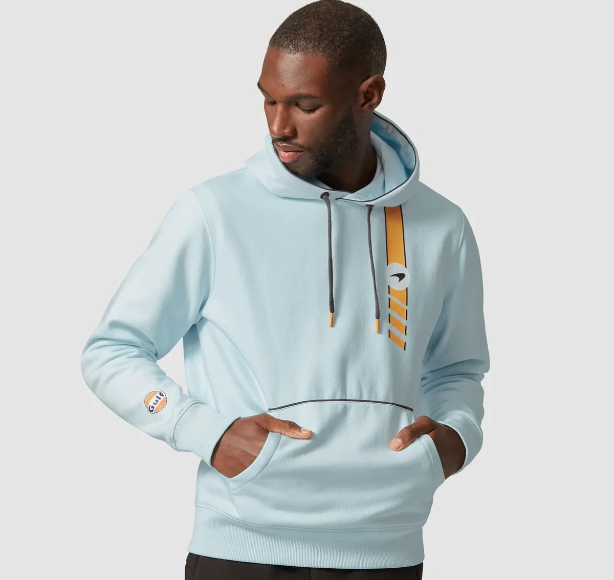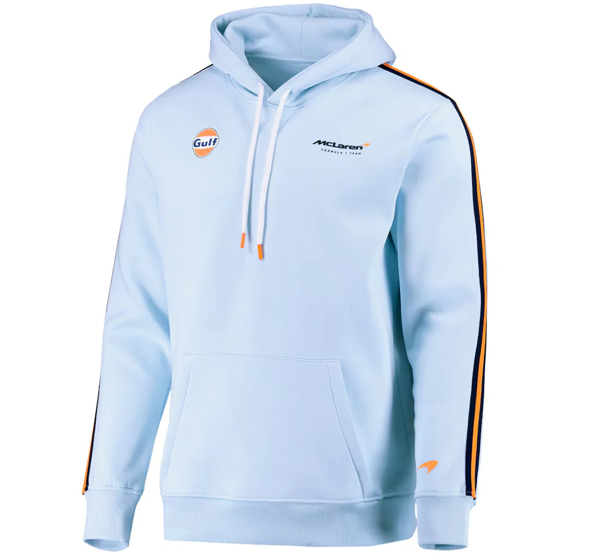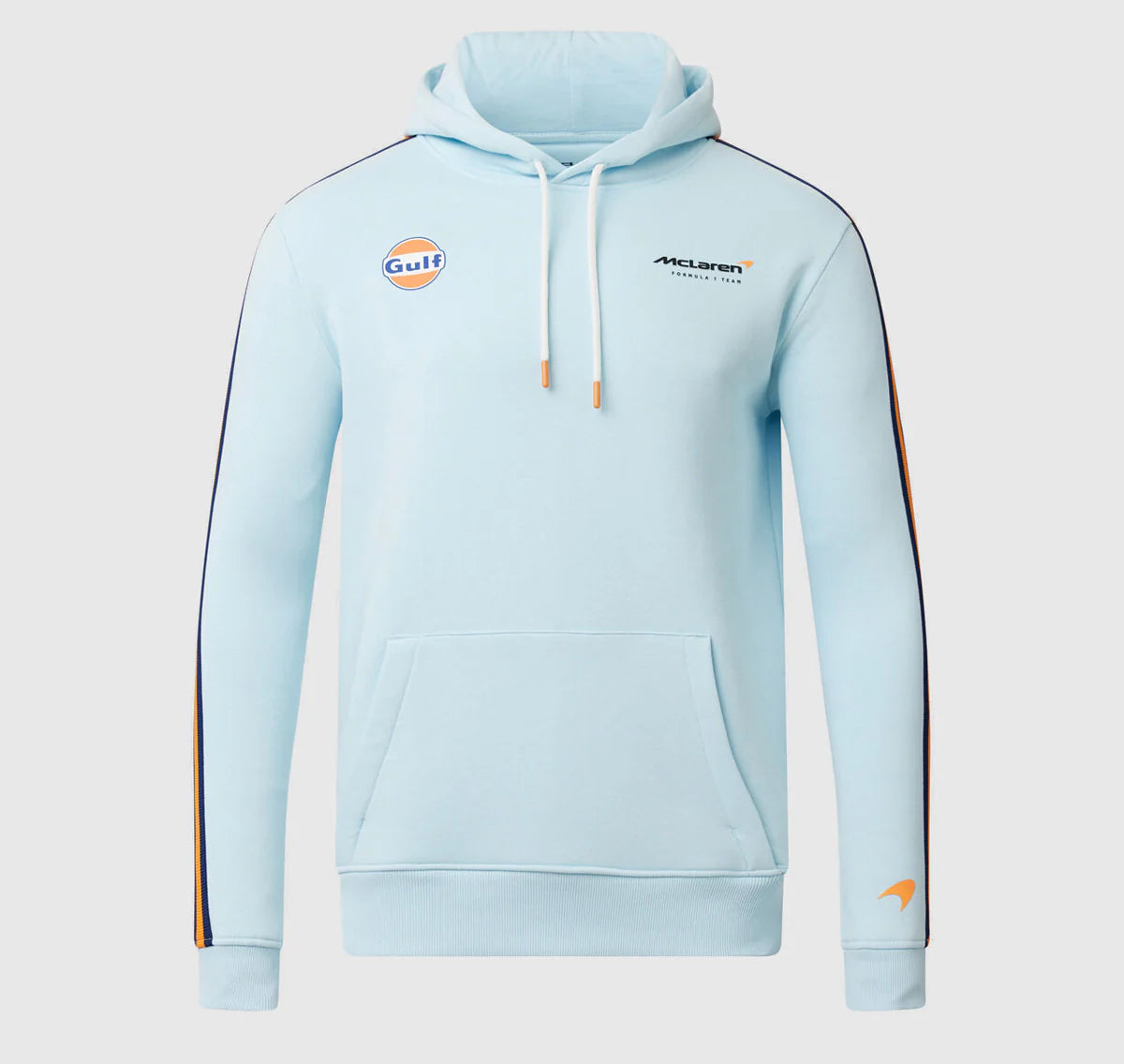 meticulously executed in color, inspired by the Gulf livery, this hoodie embodies the spirit of the McLaren F1 heritage and delivers a modern, refined aesthetic. It is more than clothing; it is a statement of motorsport history and passion.