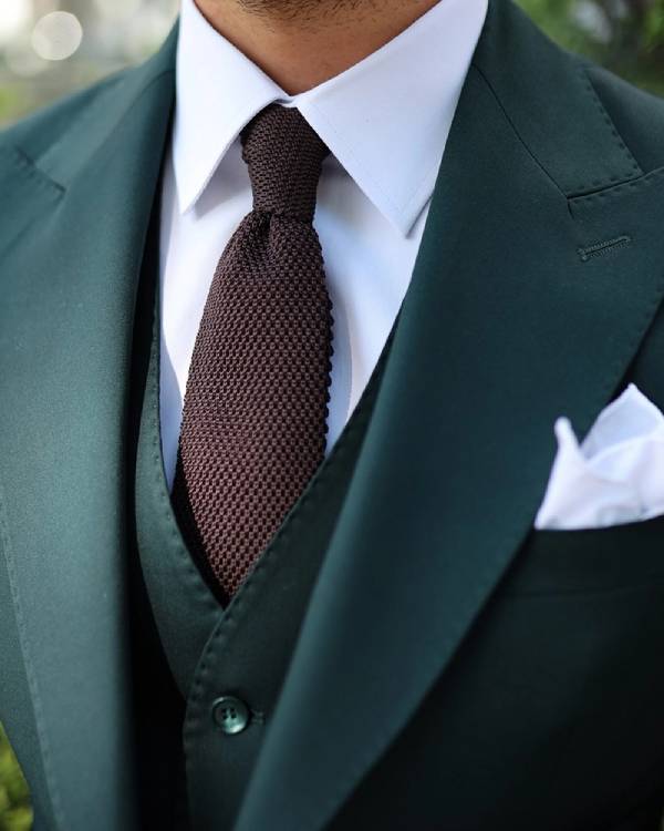 The best thing to wear with this two-piece suit is a white shirt and a bright pocket square to emphasise the classy dark green colour. Provide accessories with polished black or brown shoes to achieve the optimal balance between being traditional and being trendy.