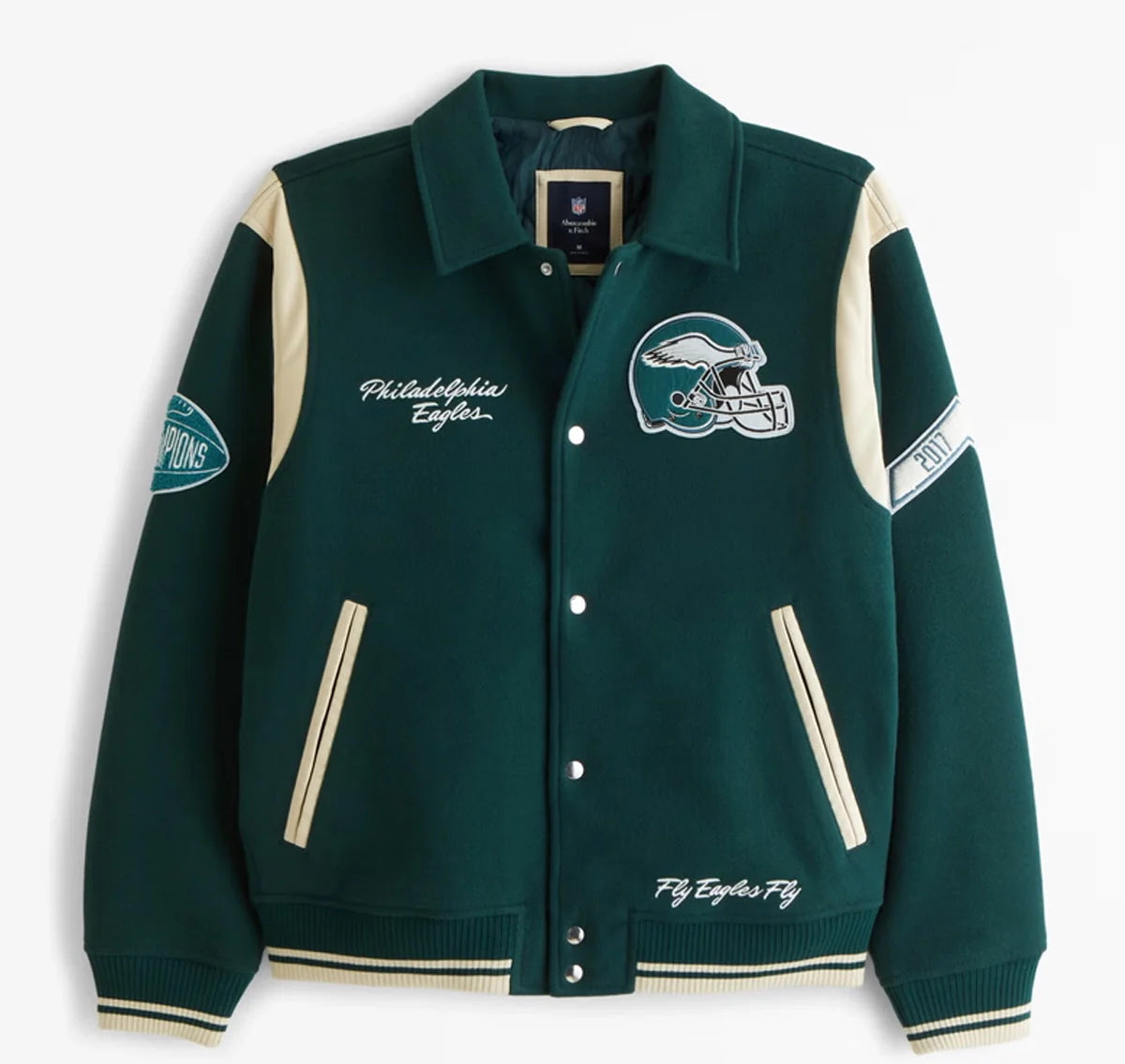 Not only does this bomber jacket look good, but it is extremely convenient as well. With two outside and two inside pockets, it has the space you need to keep the things you definitely need, such as your phone, keys and even a wallet. Equally, the vibrant color green plus the embroidered badges in Eagles will ensure that you look out of place as you support your preferred team