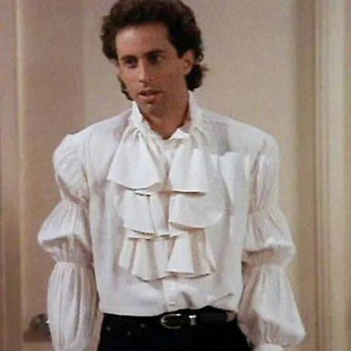 You’d expect this shirt to feel like a stiff costume, but it actually doesn’t at all. It’s made from a light cotton-poly blend, so it’s soft and easy to wear. The sleeves are big and dramatic, and the front has those over-the-top ruffles just like the one Jerry wore on Seinfeld. It’s meant to be oversized, so it hangs loose and relaxed. You can tuck it in or let it flow it works either way. Funny, bold, and surprisingly wearable.